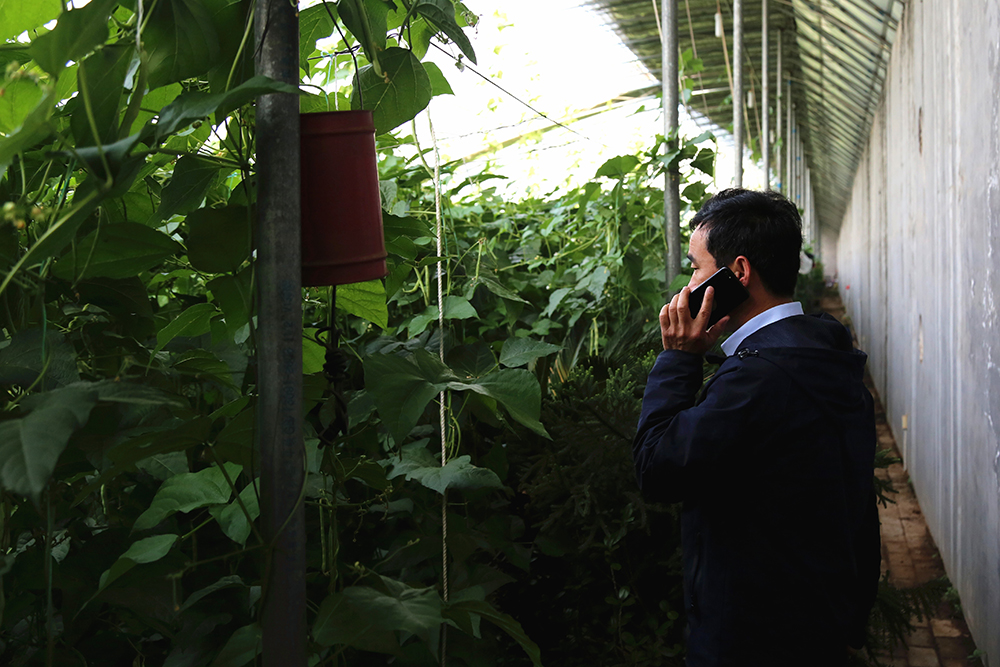 7:30當我們到達陳德國所在的大棚區(qū)時,他已經工作了一個小時。“像這種老葉、黃葉要抓緊摘掉了,到了一定年限就只吃飯不干活,影響光合作用。”在蕓豆種植棚,陳德國正在電話指導著種植戶。