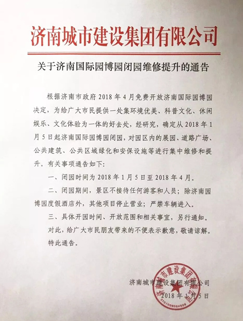 關(guān)于濟南國際園博園閉園維修提升的通告
