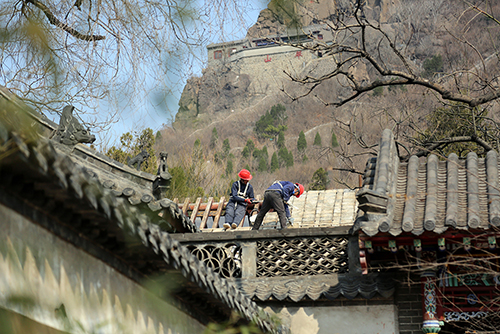 華陽(yáng)宮古建筑群此次修復(fù)工作重點(diǎn)對(duì)古建筑的屋面、墻面、地面、院墻、路面、彩繪等進(jìn)行保護(hù)性修繕和修復(fù),“四大工種”缺一不可。此外,基礎(chǔ)設(shè)施建設(shè)和環(huán)境整治提升也是此次修復(fù)的重要內(nèi)容,還涉及到現(xiàn)代建筑中的消防、安防、防雷、市政、園林等專業(yè)。