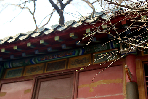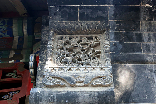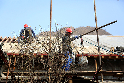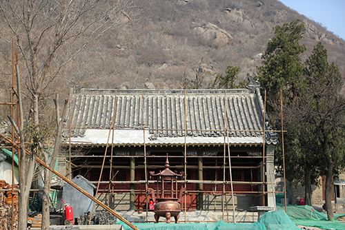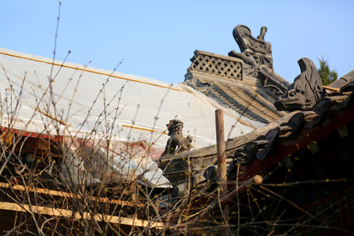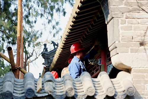 在現(xiàn)場(chǎng)可以看到,冬季過(guò)后,“修煉內(nèi)功”的綜合管線敷設(shè)、地形塑造、受損的磚作石作木作基底清理工作已基本完成,“濕作業(yè)”階段已經(jīng)全面展開(kāi)。目前正在進(jìn)行中的主要工作為建筑屋面的修繕,建筑墻體的修補(bǔ),路面、石階、古磚的清理修復(fù),建筑木構(gòu)件的砍活與重新上漆,木構(gòu)件表面彩繪的清理除塵等工作。