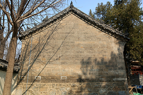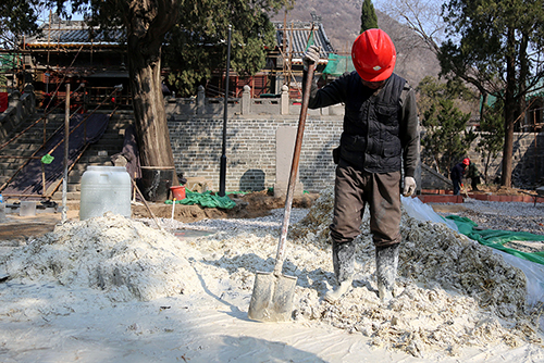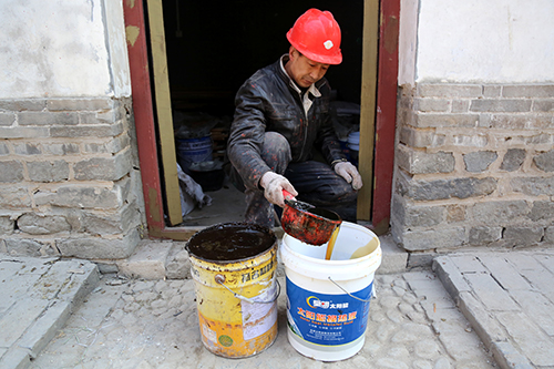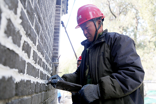 古法之三,磚藥與青磚白灰。在華陽(yáng)宮內(nèi)的古建墻壁上,很多磚塊因?yàn)槟甏眠h(yuǎn)及腐蝕原因,有不同程度的破損,對(duì)墻面破損較輕微的磚塊,以修復(fù)方式,不作替換,具體用水泥、松煙與磚沫制成與墻面顏色一致的磚藥,用磨平與壓死的方式修補(bǔ),還原磚塊原樣。在墻面修補(bǔ)方面,采用青磚白條灰勾縫進(jìn)行處理,恢復(fù)古建筑外貌。據(jù)了解,一位技術(shù)工人一天約能完成高度約50公分的青磚白條灰勾縫修補(bǔ)工作。