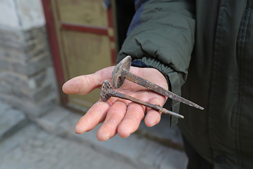 古法之六,蓋頭釘。華陽(yáng)宮古建筑中用來(lái)固定檁條、望板等構(gòu)件的蓋頭釘,保存完好的兩三百年都未生銹,此次修復(fù)過(guò)程中替換的蓋頭釘仍采用古法鍛造,替換部分腐蝕無(wú)法使用的舊釘,而這種技藝的蓋頭釘,目前國(guó)內(nèi)基本只有曲阜的幾家作坊還在生產(chǎn)制作。