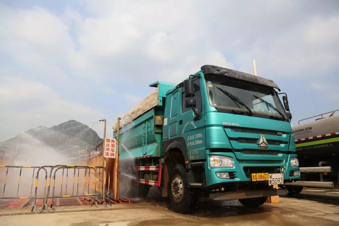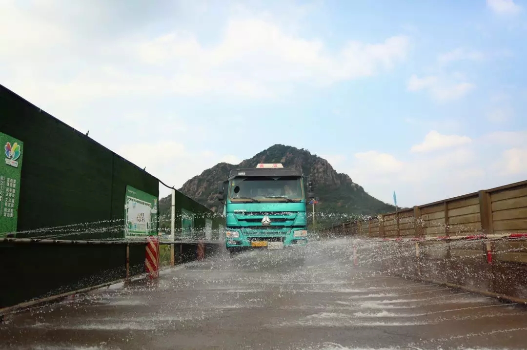 該項(xiàng)目除按照相關(guān)要求安裝自動(dòng)汽車沖洗平臺(tái)、便道兩側(cè)設(shè)置環(huán)場噴淋、出入口安裝24小時(shí)揚(yáng)塵在線監(jiān)測和視頻監(jiān)控設(shè)備外,還組織了各參建單位技術(shù)力量,創(chuàng)新開發(fā)了不停車沖洗設(shè)施作為輔助標(biāo)準(zhǔn)化洗車平臺(tái),以加強(qiáng)沖洗效果。出入口設(shè)置凈車檢查點(diǎn),對(duì)沖洗不徹底的部位,采用手持高壓水槍進(jìn)行徹底清洗。目前項(xiàng)目的各出入口均已配置2臺(tái)自動(dòng)汽車沖洗平臺(tái),2臺(tái)高壓水槍和不停車沖洗設(shè)施。通過以上措施,實(shí)現(xiàn)施工范圍內(nèi)揚(yáng)塵情況24小時(shí)零死角監(jiān)控,確保外運(yùn)車輛不帶泥上路。