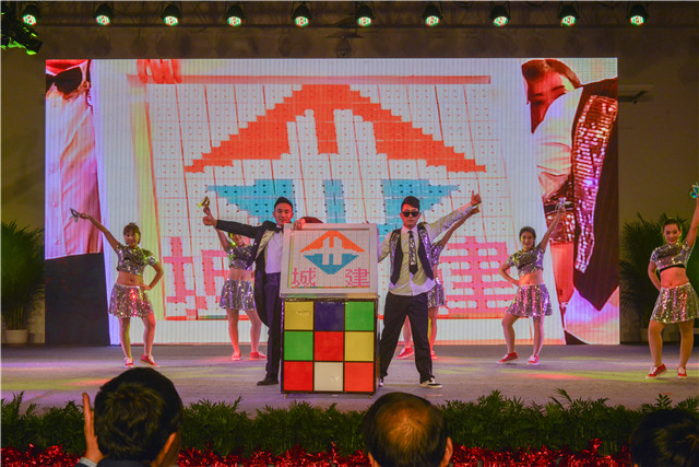 在歡快喜悅的歌舞《拜新年》中,匯演拉開序幕,紅紅火火的舞臺,映射著蒸蒸日上的發(fā)展勢頭。舞蹈《成長》《奮進(jìn)》以激昂的音樂,吹響了催人奮進(jìn)的號角,用動感的舞步,舞出了城建鐵軍的蓬勃朝氣?!恶R路情緣》《鐵軍男相親記》《生日》《真相》《男爭女辯》《筑夢同行》等語言類節(jié)目圍繞生產(chǎn)經(jīng)營精心編排,真實感人,催人奮進(jìn)。勵志感人的歌曲,絢麗多彩的歌伴舞,酷炫的舞蹈,神秘的魔術(shù),魔幻的黑光劇,生龍活虎的京劇,讓觀眾著實過了一把眼癮,臺下掌聲不斷,歡欣喜悅的氣氛一浪高過一浪。小品里父母、妻子、孩子那一段段心里話,令人感同身受,潸然淚下,家屬們用實際行動表達(dá)了對企業(yè)最大的理解和支持,大家在這個溫暖的大家庭中,以誠相待,溫馨彼此。在激動人心的歌舞串燒《開創(chuàng)未來》中,匯演圓滿落下帷幕,集團(tuán)領(lǐng)導(dǎo)與演職人員合影留念。