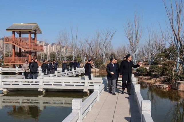 徐群一行首先來到華山歷史文化生態(tài)濕地公園,聽取工作人員介紹了項(xiàng)目的整體規(guī)劃和建設(shè)情況,并實(shí)地察看了公園試驗(yàn)段和園林一期A區(qū),參觀過程中,徐群副市長對效果初顯的900畝山水園林景觀表示了肯定,并對項(xiàng)目未來整體效果表示期待。