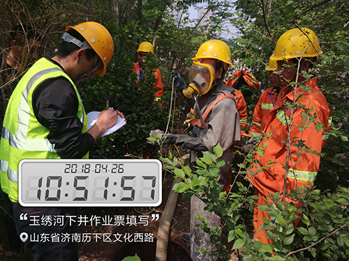 由于人工下井作業(yè)危險(xiǎn)較大,方案制定完成后搶險(xiǎn)小組立即向公司安全質(zhì)量部進(jìn)行匯報(bào),經(jīng)過安全質(zhì)量部批準(zhǔn)于4.26日進(jìn)行人工下井作業(yè)?,F(xiàn)場工作人員嚴(yán)格按照下井作業(yè)施工流程,認(rèn)真填寫《下井作業(yè)票》、《有限空間作業(yè)票》等最終將工作人員將阻塞在管口的立沿石等阻塞物取出,管道又恢復(fù)了正常運(yùn)行,玉繡河也恢復(fù)了往日的清澈。