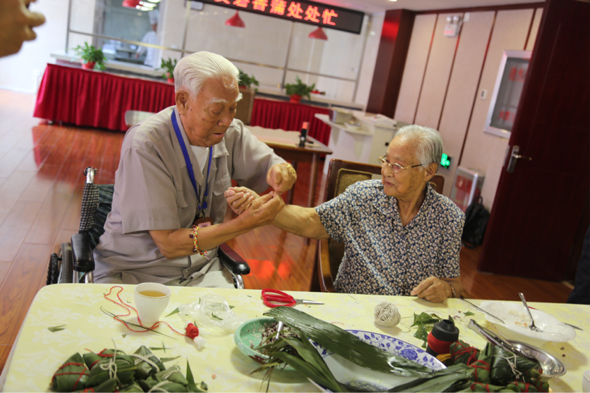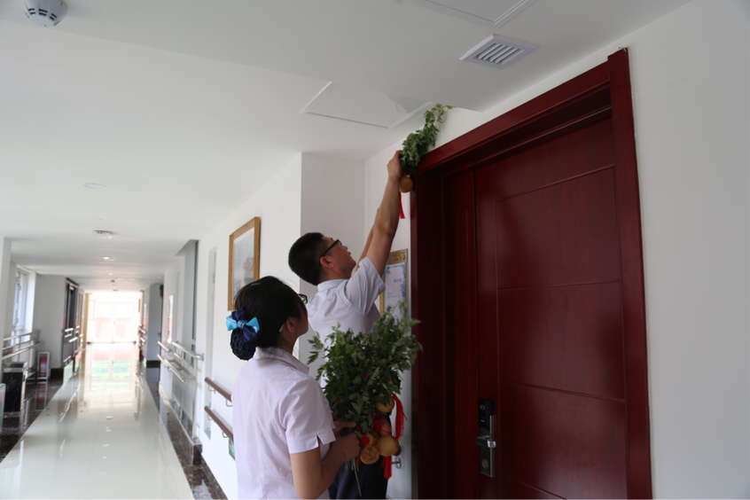 一大早,服務人員便和老人們一起在門口掛起了艾草和小葫蘆。老人還親手編織了五彩繩,和工作人員們親手系上。