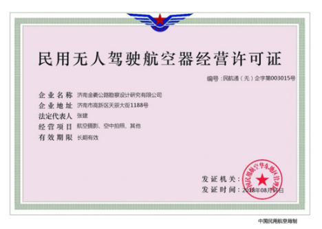 根據(jù)民航部門頒布的《民用無人駕駛航空器經(jīng)營性飛行活動(dòng)管理辦法》及《無人機(jī)駕駛航空器飛行管理暫行條例》規(guī)定,濟(jì)南金衢公路勘察設(shè)計(jì)研究有限公司即刻選派人員參加無人機(jī)駕駛員培訓(xùn),于2018年8月16日獲得“中國民用航空華東地區(qū)管理局頒發(fā)的《民用無人駕駛航空器經(jīng)營許可證》”,公司員工李波同志獲得民用無人機(jī)駕駛員合格證和無人機(jī)超視距駕駛員合格證。