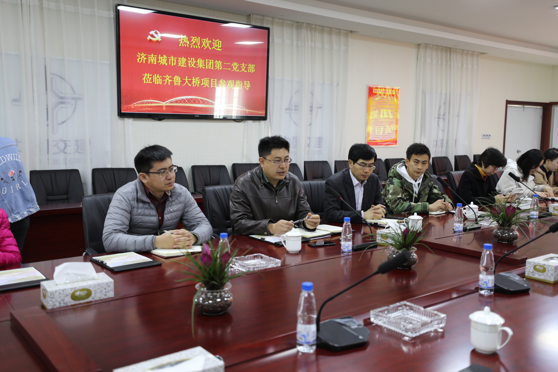 全體人員在集團(tuán)總會(huì)計(jì)師范天云的帶領(lǐng)下,首先來(lái)到齊魯大道北延工程項(xiàng)目經(jīng)理部,與公司副總經(jīng)理趙世超及工作人員進(jìn)行了座談,雙方首先介紹了各自支部情況及組織建設(shè)情況并進(jìn)行了交流。隨后,項(xiàng)目負(fù)責(zé)人對(duì)工程進(jìn)行了詳細(xì)的介紹,并參觀了齊魯黃河大橋橋梁模型、觀看了黃河大橋建設(shè)宣傳片,展示了齊魯黃河大橋的建設(shè)過(guò)程及原理。作為目前同類(lèi)橋型跨徑世界第一網(wǎng)狀吊桿系桿拱橋,其所展現(xiàn)的創(chuàng)新技術(shù)、建成效果以及打造的“黃河橋梁文化”令人驚嘆和期待。