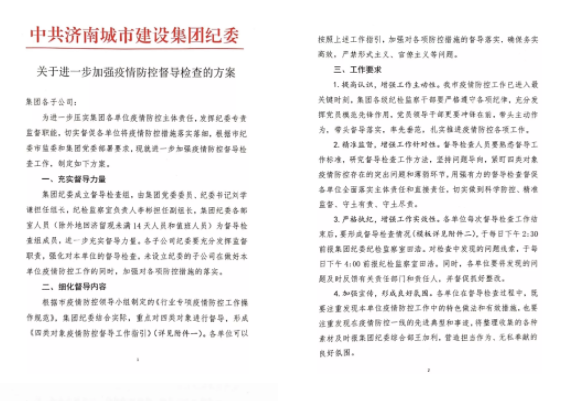 疫情就是命令,防控就是責(zé)任。濟(jì)南城市建設(shè)集團(tuán)把疫情防控作為當(dāng)前最重要的政治任務(wù)來抓,按照中央、省、市委關(guān)于做好新型冠狀病毒肺炎疫情防控的部署和要求,快速響應(yīng),迅速部署,采取有力措施,注重黨委、紀(jì)委兩個責(zé)任的協(xié)同配合,深化一線督導(dǎo)檢查,以最堅決的態(tài)度、最嚴(yán)格的執(zhí)行、最果斷的行動,全力以赴推動疫情防控責(zé)任落實。
