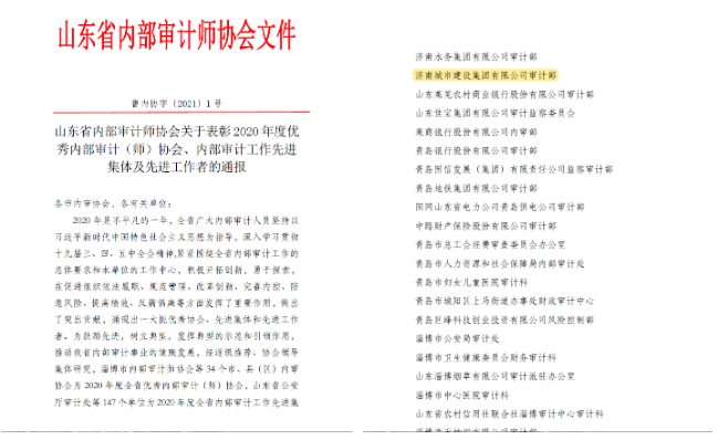 今年以來(lái),通過(guò)加快建章立制,明確規(guī)定了審計(jì)年度計(jì)劃制定、方案制定、證據(jù)收集、底稿日志編寫(xiě)、報(bào)告質(zhì)量控制、檔案管理等全流程標(biāo)準(zhǔn),逐步形成了一整套行之有效的內(nèi)部審計(jì)制度體系,并榮獲“山東省內(nèi)部審計(jì)工作先進(jìn)單位”稱(chēng)號(hào)。