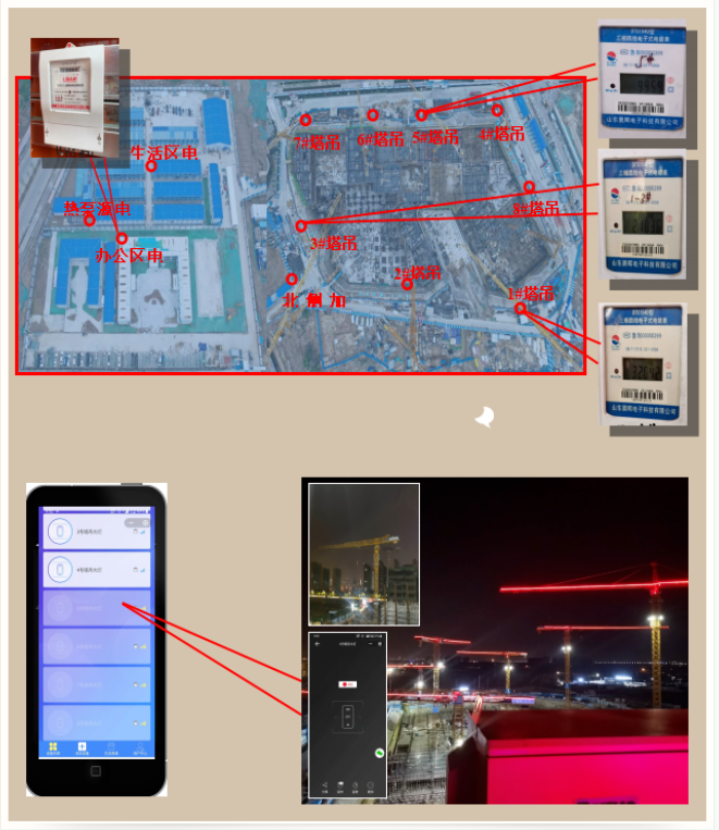 在房建類項(xiàng)目建設(shè)中,通過(guò)用電分區(qū)計(jì)量,將施工用電,辦公用電,生活用電均分開計(jì)量,現(xiàn)場(chǎng)8臺(tái)塔吊,均單獨(dú)計(jì)量,項(xiàng)目安排專人每月底抄表,做好用電臺(tái)賬,并統(tǒng)計(jì)分析,糾偏查因。同時(shí)通過(guò)項(xiàng)目部塔吊大燈遠(yuǎn)程智能控制系統(tǒng),保證施工現(xiàn)場(chǎng)無(wú)人施工時(shí)能第一時(shí)間利用APP使塔吊鏑燈,節(jié)約能源。