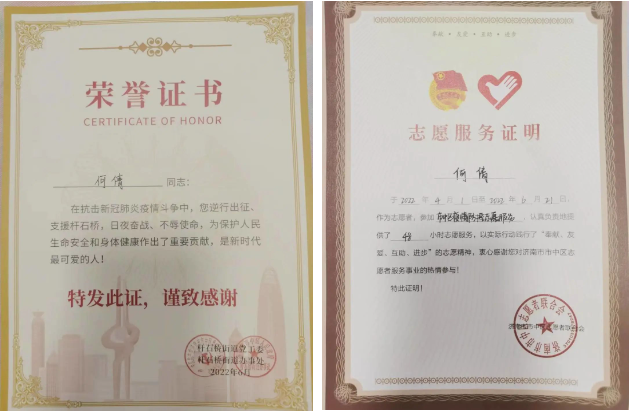 在疫情防控期間,何倩主動請纓,逆行出征,協(xié)助桿石橋街道完成核酸檢測、物資搬運(yùn)等疫情防控工作,得到了社區(qū)的高度認(rèn)可。