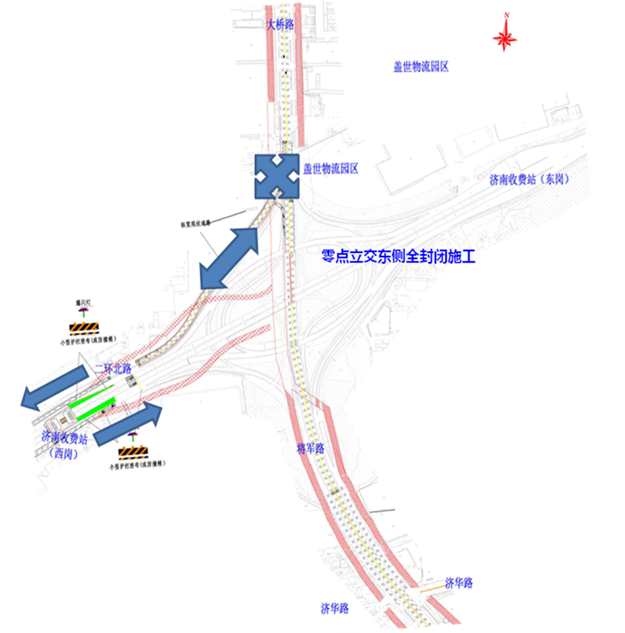 在此期間,零點立交橋下的大橋路南北向及G35濟廣高速主線東西向車輛正常通行。二環(huán)北路由西向東前往零點立交以北的左轉車輛,需通過零點立交橋西北象限擴建現(xiàn)狀道路與大橋路交叉口(現(xiàn)狀燈控口)進行交通轉換。其它車輛均需通過外圍相關道路繞行。