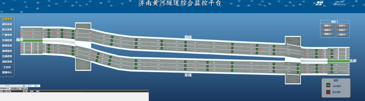 在濟(jì)南黃河濟(jì)濼路隧道中,交通系統(tǒng)的主要設(shè)備包括72個(gè)道路指示燈、7塊情報(bào)板和12組車(chē)感線圈,設(shè)備的應(yīng)用可以有效地誘導(dǎo)車(chē)輛按照規(guī)定的路線和速度行駛,保證交通流暢和安全,進(jìn)一步提高交通運(yùn)營(yíng)效率;