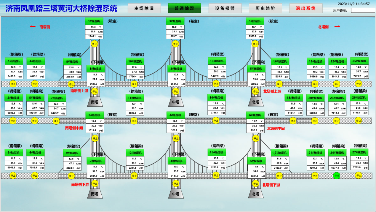 為保持橋梁結(jié)構(gòu)強(qiáng)度,防止鋼箱梁、內(nèi)部鋼架、主纜銹蝕,延長(zhǎng)橋梁使用壽命,大橋安裝有3套主纜除濕系統(tǒng)、6套鞍室除濕系統(tǒng)、6套主塔除濕系統(tǒng)、27套鋼箱梁除濕機(jī)。所有除濕機(jī)都使用網(wǎng)格連接,通過(guò)邏輯控制系統(tǒng)實(shí)現(xiàn)數(shù)據(jù)共享、自動(dòng)化除濕等任務(wù),時(shí)刻消除設(shè)備頑疾病害,提高行車(chē)安全系數(shù)。