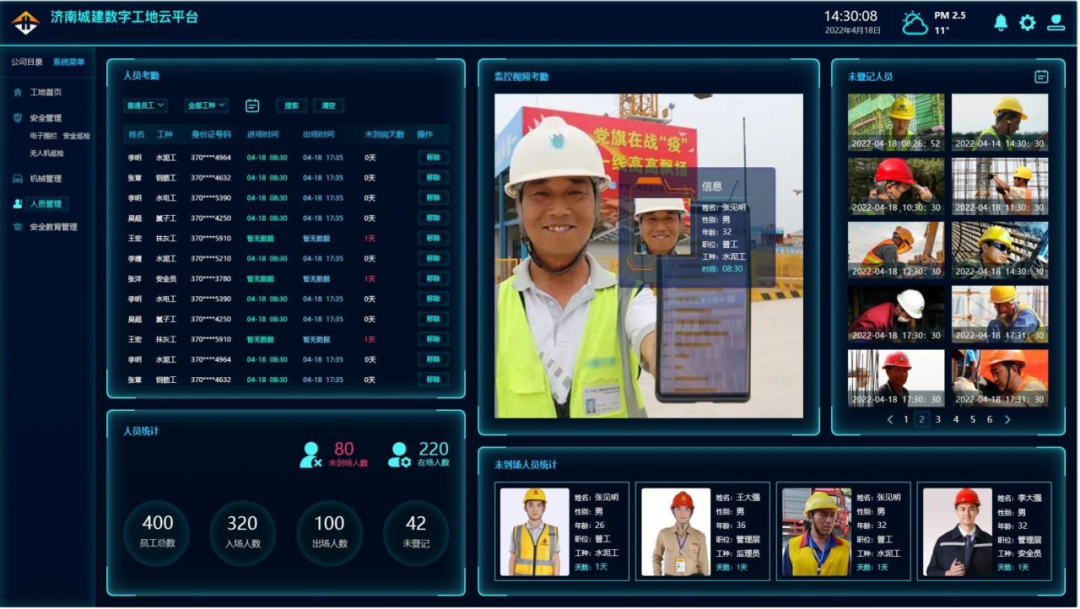 人員管理實(shí)現(xiàn)優(yōu)化,G104京嵐線濟(jì)南黃河公路大橋擴(kuò)建工程項(xiàng)目應(yīng)用智能化勞務(wù)人員管理系統(tǒng),系統(tǒng)根據(jù)視頻采樣,可以實(shí)時(shí)定位,統(tǒng)計(jì)當(dāng)日出勤人數(shù),能夠針對(duì)不系安全帶、不正確佩戴安全防護(hù)用品,違章動(dòng)火作業(yè)等進(jìn)行智能識(shí)別,并抓拍報(bào)警。系統(tǒng)累計(jì)保障工地安全620天,累計(jì)錄入工人800余人,攝像頭安裝17個(gè),避免了火災(zāi),機(jī)械違規(guī)載人,安全用品佩戴不規(guī)范,防護(hù)缺失等隱患發(fā)生。