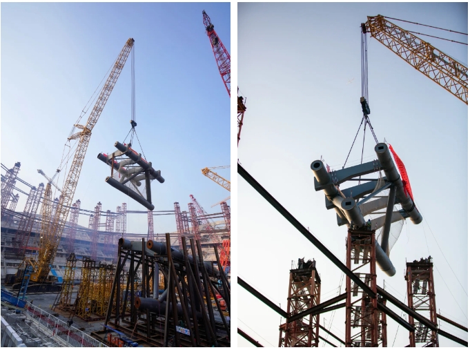 本次實施的首次吊裝段,位于內(nèi)環(huán)桁架,單元吊重達(dá)168噸,起吊縱深高達(dá)60余米。項目位于濟(jì)南新舊動能轉(zhuǎn)換起步區(qū),建筑面積19.73萬平方米,建筑高度為60米,是山東省首個6萬座專業(yè)足球場,可承辦國際、國內(nèi)重大體育賽事。同時也是國內(nèi)體育場館懸挑長度最大的工程,最大懸挑長度達(dá)到了45米,屋蓋鋼結(jié)構(gòu)由星形拱桁架、內(nèi)環(huán)桁架、外環(huán)桁架、單層網(wǎng)格及挑檐組成,總鋼量約3.1萬噸,靠36根排架柱支撐,形成巨型無柱大懸挑空間,在整體結(jié)構(gòu)中起到了承上啟下作用,下方排架柱與混凝土結(jié)構(gòu)相連,上方支撐索結(jié)構(gòu)、膜結(jié)構(gòu)。項目預(yù)計在2026年底竣工驗收完成。