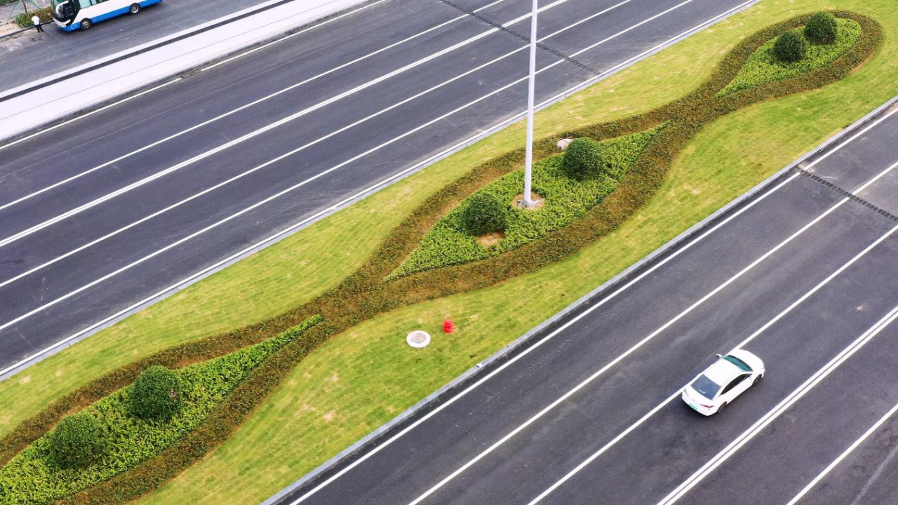 高架橋上采用了創(chuàng)新性非線性排水溝,兼顧橋面排水需求,造價(jià)低,施工簡單,耐久性好。道路周邊精心設(shè)計(jì)了綠植造型,下穿隧道采用了藍(lán)色星空頂,園林小品的愜意和藍(lán)色星空隧道的靚麗,為濟(jì)南機(jī)場增添了一抹亮色。在后續(xù)的規(guī)劃中,還將有車輛隧道下穿停機(jī)坪,未來,上行飛機(jī)、下行車輛,飛機(jī)和汽車將實(shí)現(xiàn)“空陸同框”。