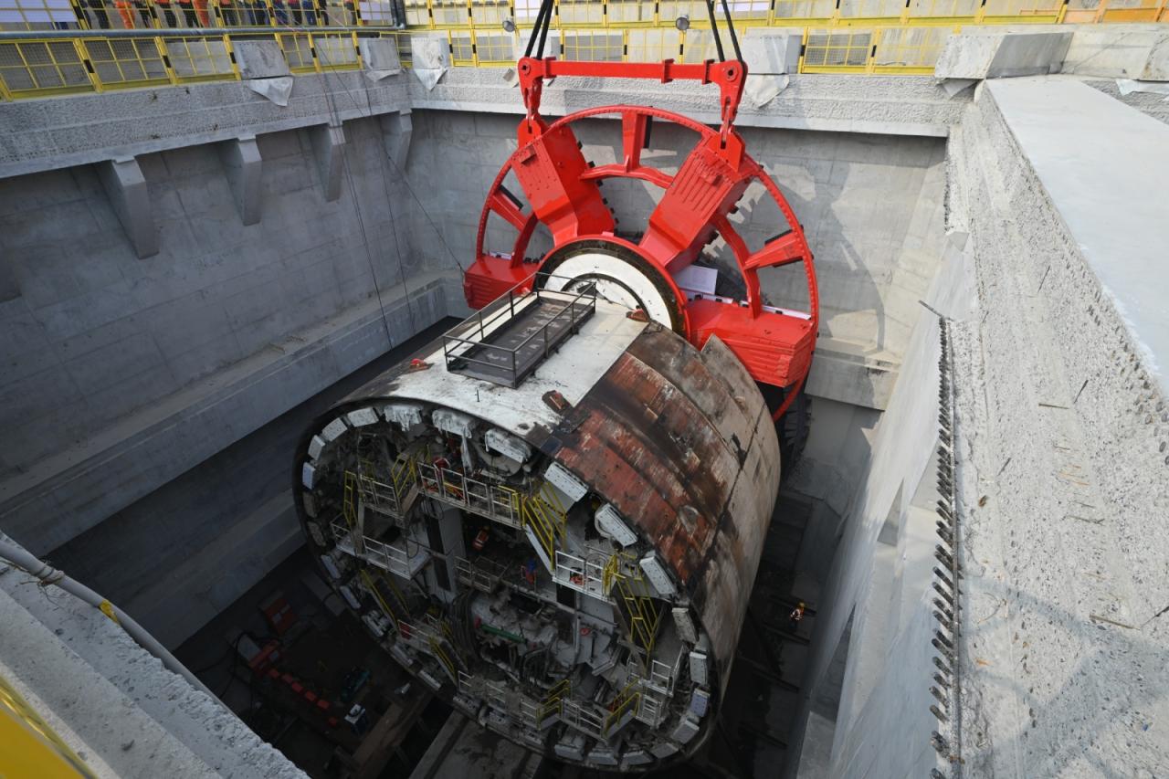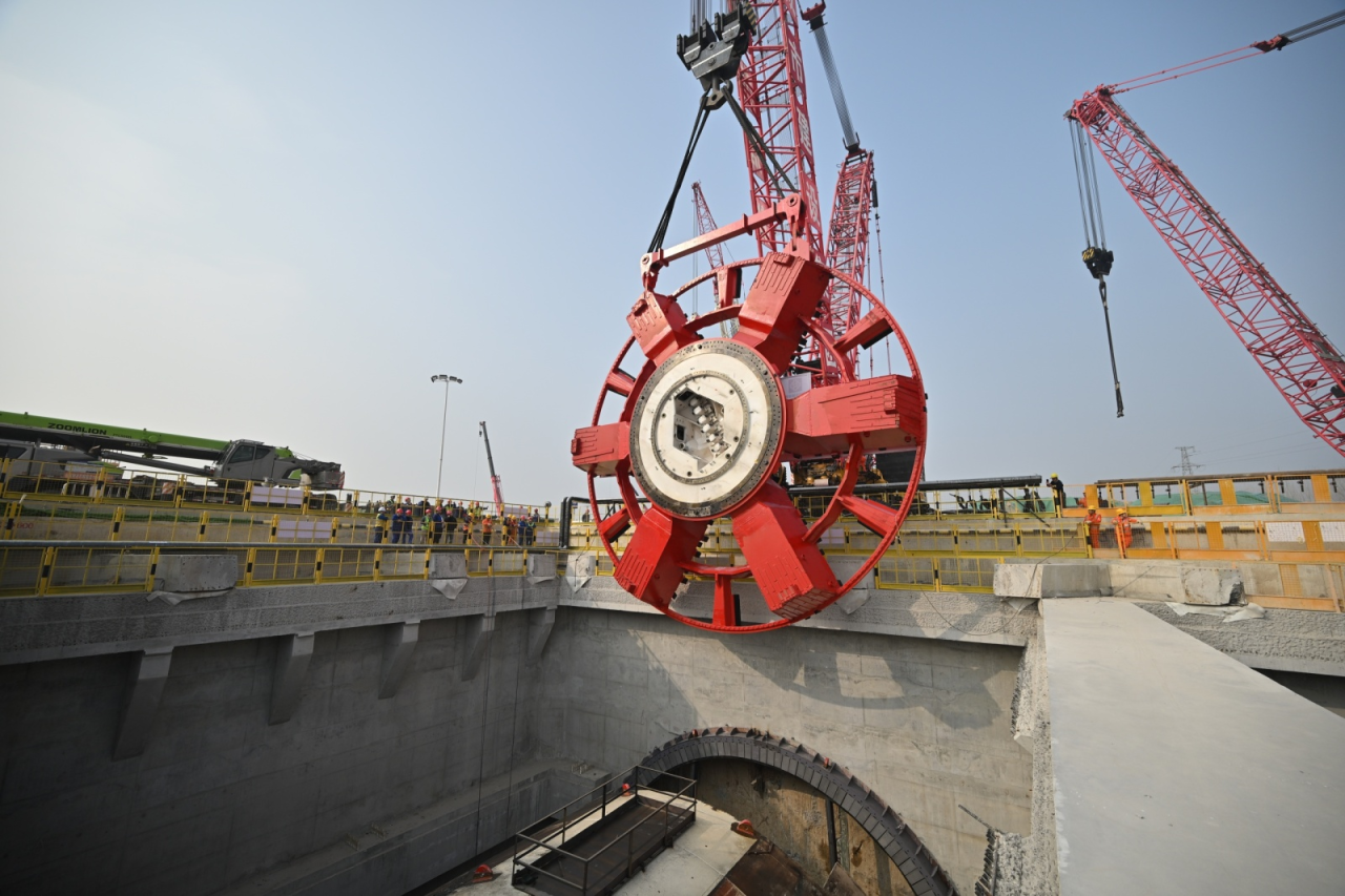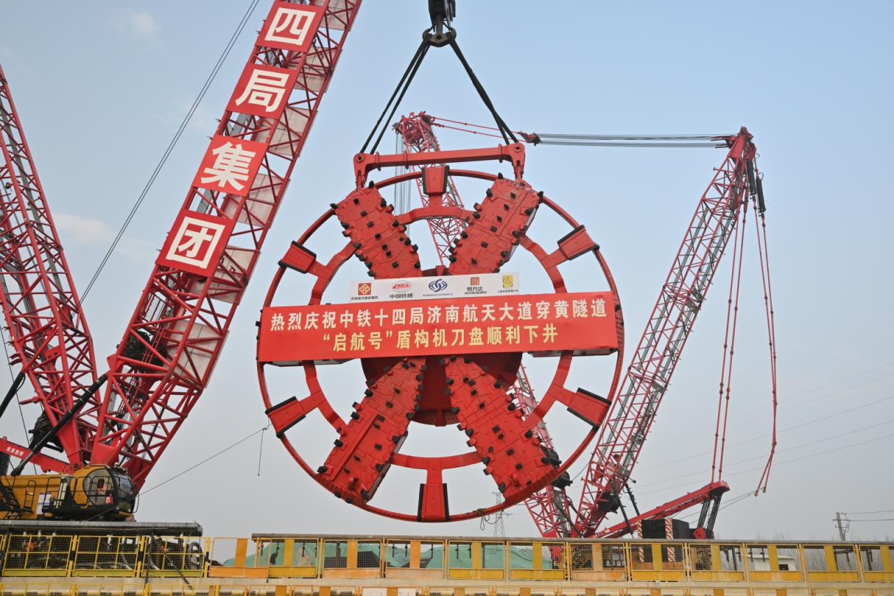 3月1日,直徑15.06米的超大直徑盾構(gòu)機“啟航號”刀盤在兩臺履帶吊助力下完成“空中轉(zhuǎn)體”后緩緩下井,與盾構(gòu)機精準(zhǔn)“合體”,標(biāo)志著由濟南城市建設(shè)集團投資建設(shè)、中鐵十四局集團承建的濟南市航天大道穿黃隧道盾構(gòu)機主機基本組裝完成,即將進入調(diào)試階段。