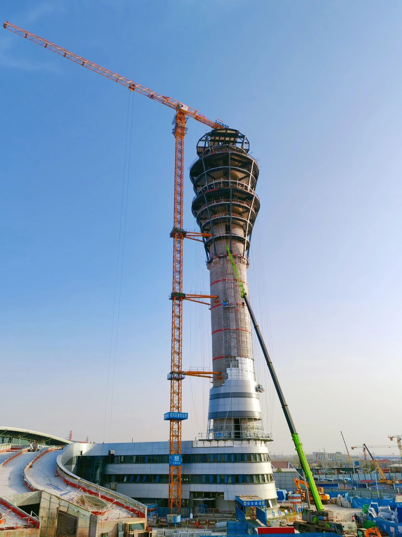 新建機場塔臺高度為99.5米,共19層,是國內(nèi)第一個具備三層指揮層的塔臺。其中19層為指揮層,可俯瞰整座機場范圍,17層和16層是機坪指揮以及空管的應急指揮層。項目于2024年1月10日開工,2024年4月30日完成土方開挖,2024年6月5日完成結(jié)構正負零,2025年1月21日塔臺核心筒封頂,2025年3月19日完成筒外鋼結(jié)構吊裝。