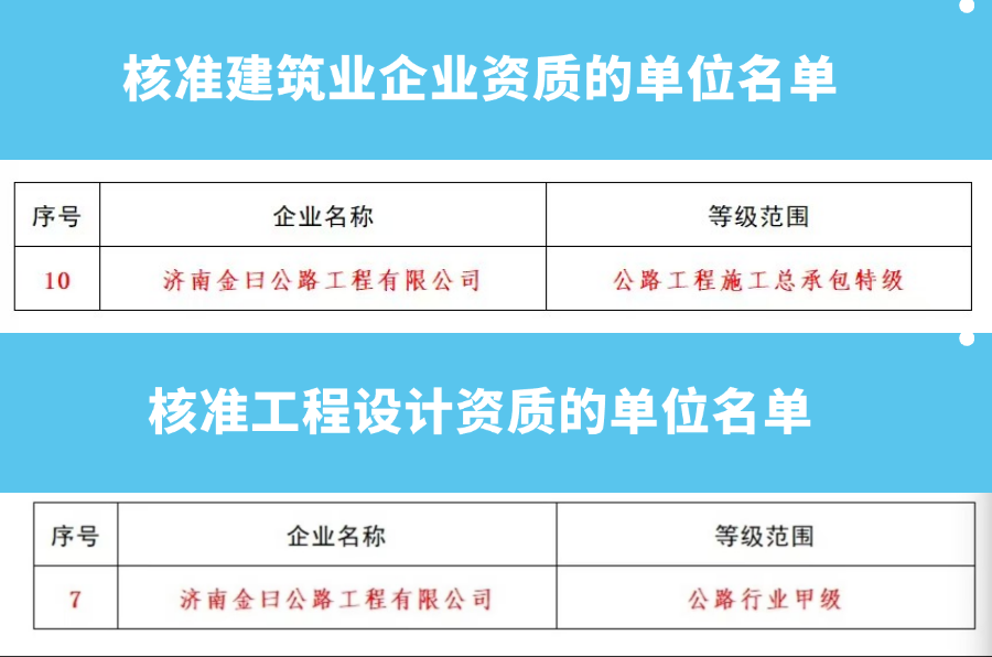 1月13日,住房和城鄉(xiāng)建設(shè)部發(fā)布《住房城鄉(xiāng)建設(shè)部關(guān)于核準(zhǔn)2025年度第一批建設(shè)工程企業(yè)資質(zhì)名單的公告》,濟(jì)南城市建設(shè)集團(tuán)所屬濟(jì)南金曰公路工程有限公司獲評(píng)公路工程施工總承包特級(jí)資質(zhì)和工程設(shè)計(jì)公路行業(yè)甲級(jí)資質(zhì)。
