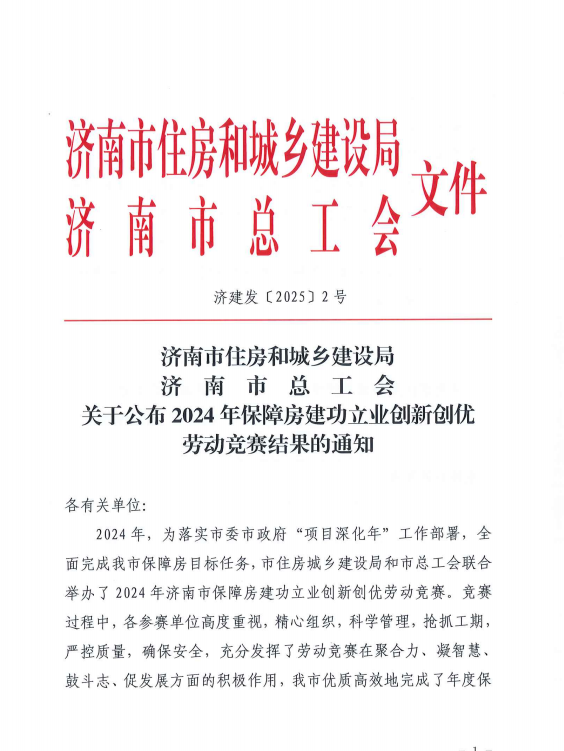 近日,濟(jì)南市住建局、市總工會(huì)公布2024年保障房建功立業(yè)創(chuàng)新創(chuàng)優(yōu)勞動(dòng)競(jìng)賽結(jié)果的通知,建設(shè)集團(tuán)所屬濟(jì)南萬(wàn)融產(chǎn)業(yè)發(fā)展集團(tuán)有限公司榮獲項(xiàng)目建設(shè)(運(yùn)營(yíng))單位二等獎(jiǎng)、公司職工金宗云獲評(píng)先進(jìn)個(gè)人,萬(wàn)融集團(tuán)所屬濟(jì)南春曉置業(yè)有限公司西客站安置二區(qū)三地塊項(xiàng)目部榮獲項(xiàng)目建設(shè)(運(yùn)營(yíng))及參建單位班組一等獎(jiǎng)。