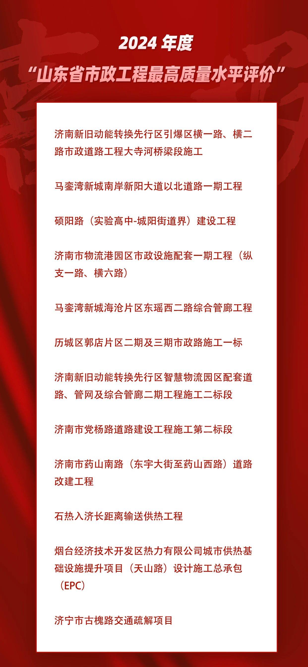 近日,山東省市政行業(yè)協(xié)會發(fā)布了《關于公布2024年度通過市政工程最高質量水平評價工程的通知》,建設集團及其所屬子公司參與的12項工程獲評2024年度山東省市政工程最高質量水平評價。