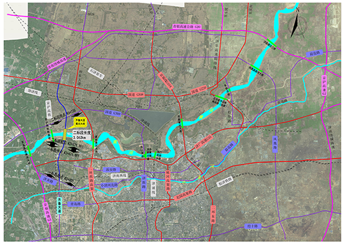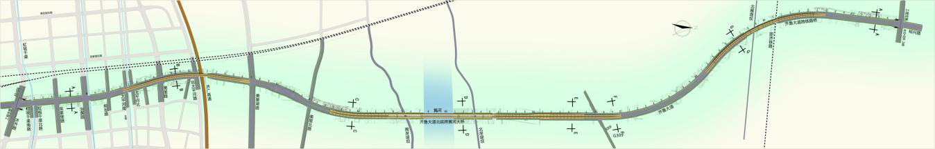 一標(biāo)段南起現(xiàn)狀濟(jì)齊路,向北與虹吸干渠南路、虹吸干渠北路、吳家堡路、治黃路、規(guī)劃路相交,采用高架形式跨越太平河南支路、太平河北支路、美里路、太平河北路、濟(jì)廣高速后,在美里湖路前落地,高架橋兩側(cè)設(shè)置一對(duì)輔道實(shí)現(xiàn)各交通流向的轉(zhuǎn)換,終點(diǎn)接黃河大橋引橋,平面線位與規(guī)劃線位一致,道路全長(zhǎng)3671.89米。
